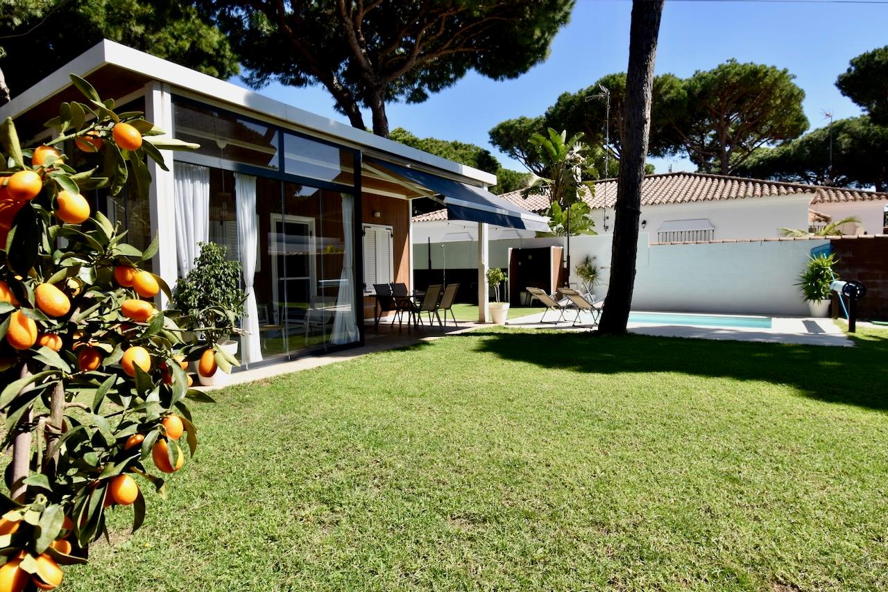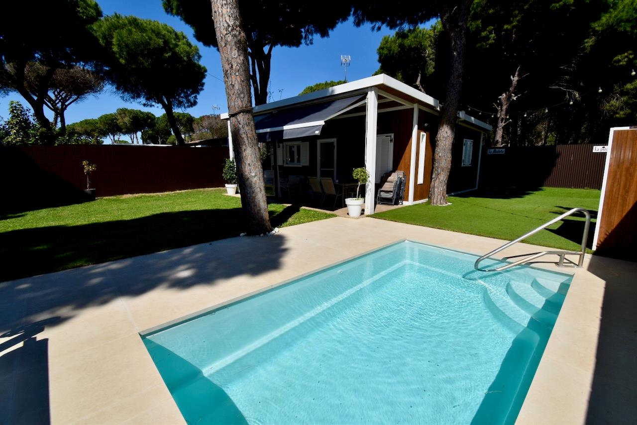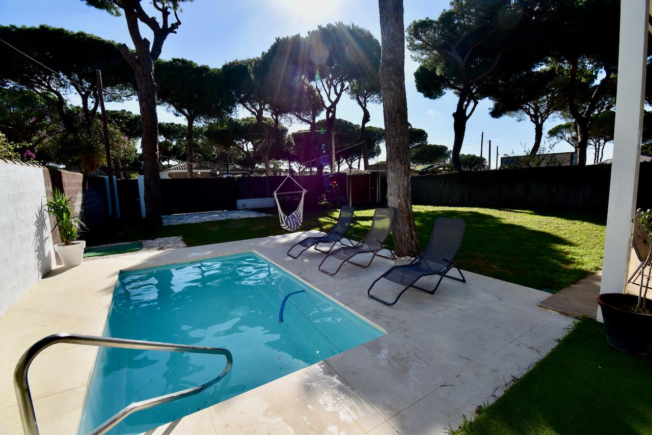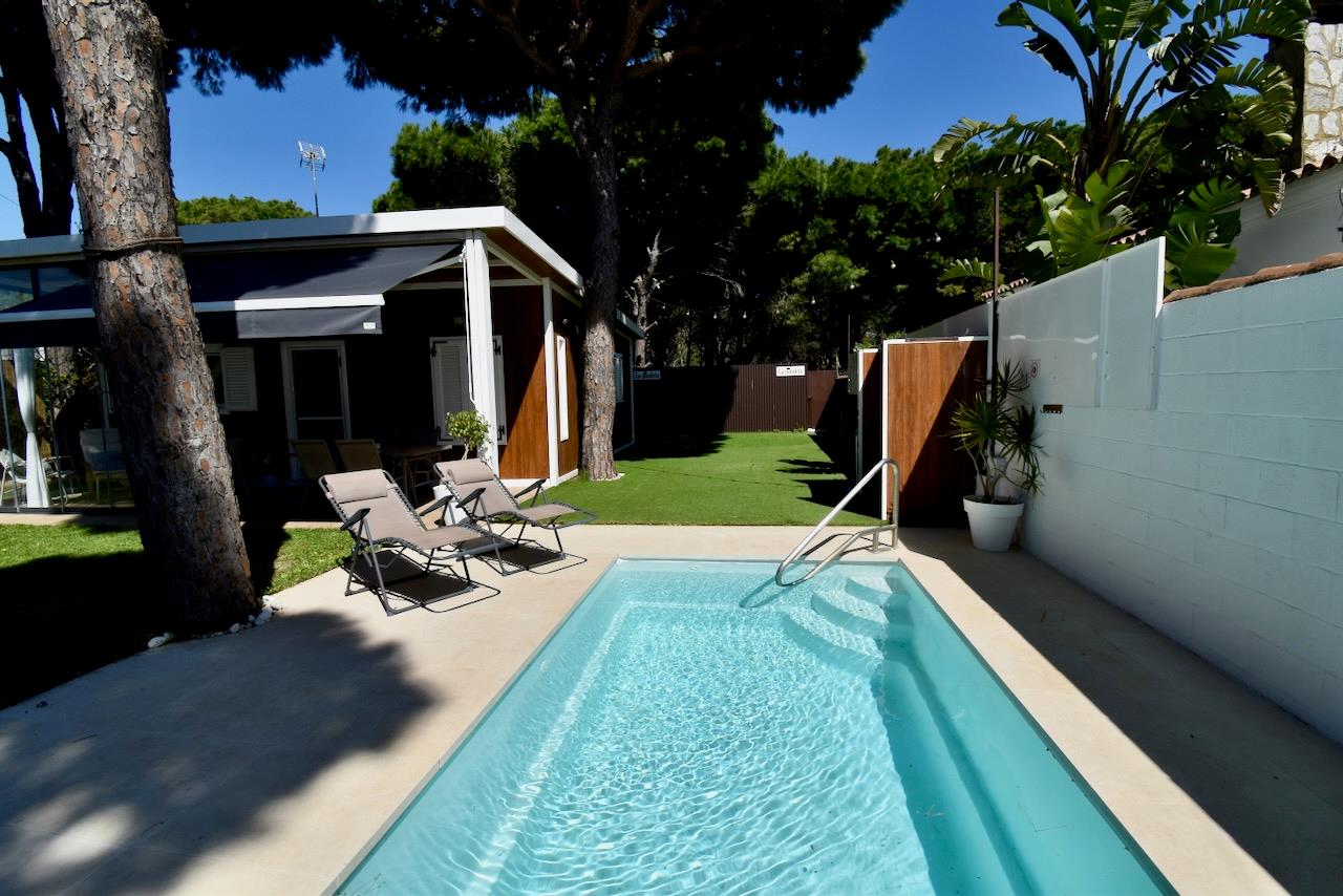 Encantadora y cómoda casa de vacaciones en Chiclana de la Frontera, Costa de la Luz, España, con piscina privada para 5 personas. La casa se encuentra en una zona rural y boscosa cerca de la playa, a 3 km de la playa de La Barrosa.