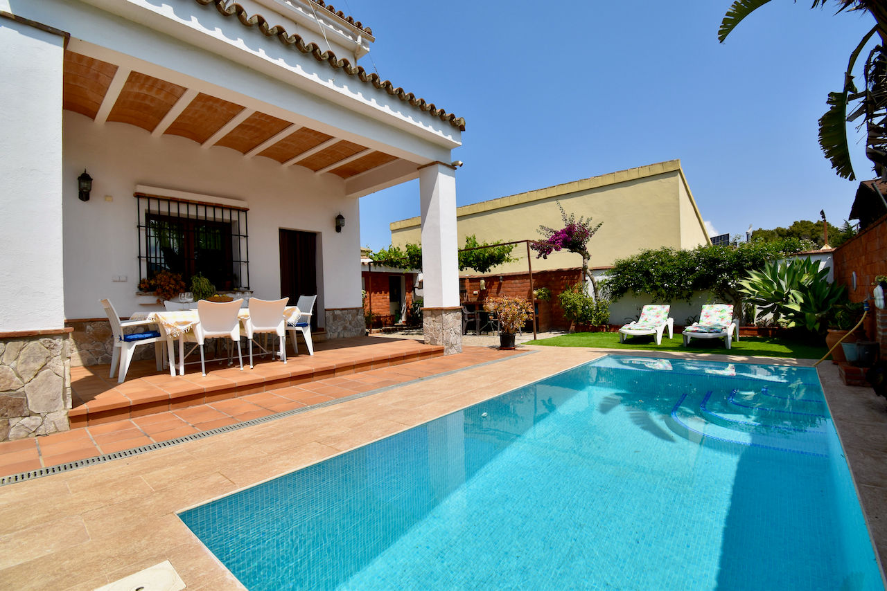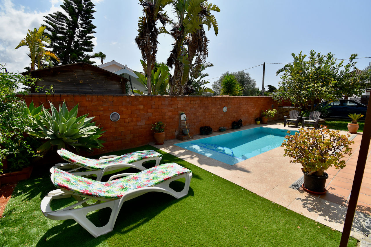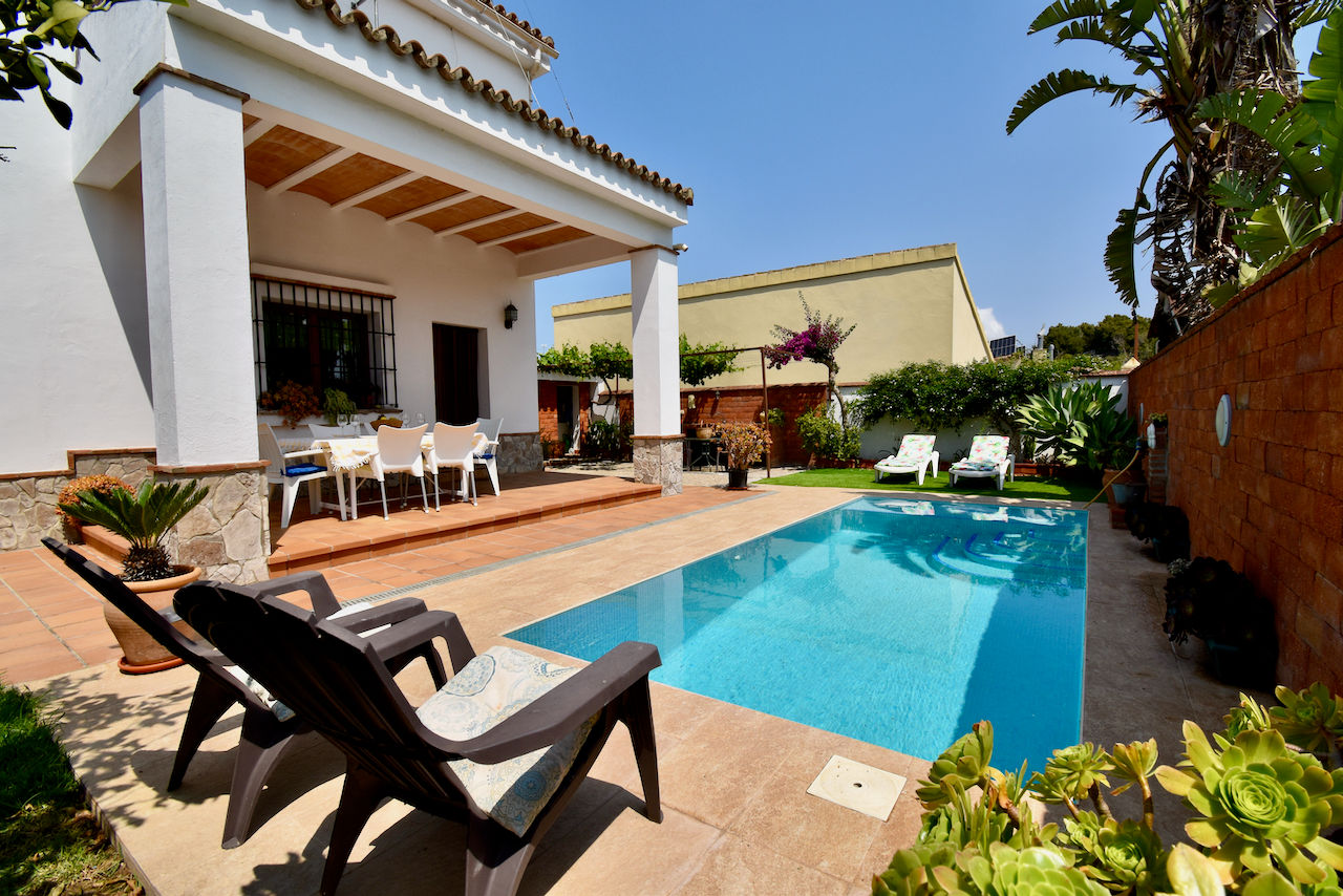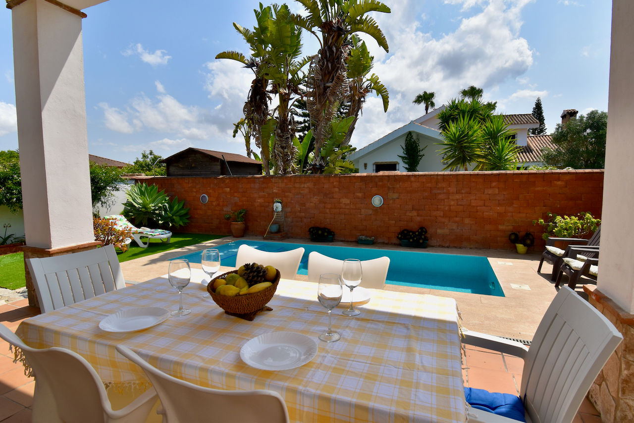 Villa preciosa y confortable en Chiclana de la Frontera, Costa de la Luz, España con piscina privada para 8 personas. La casa está situada en una zona costera y urbana y cerca de restaurantes y bares y supermercados.