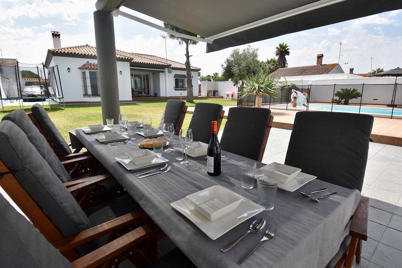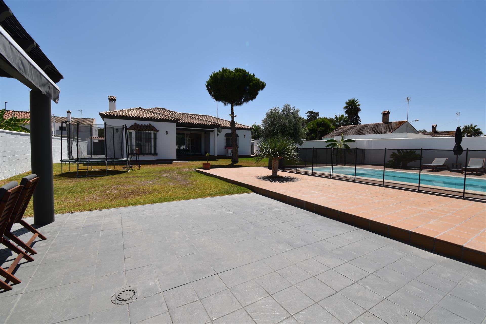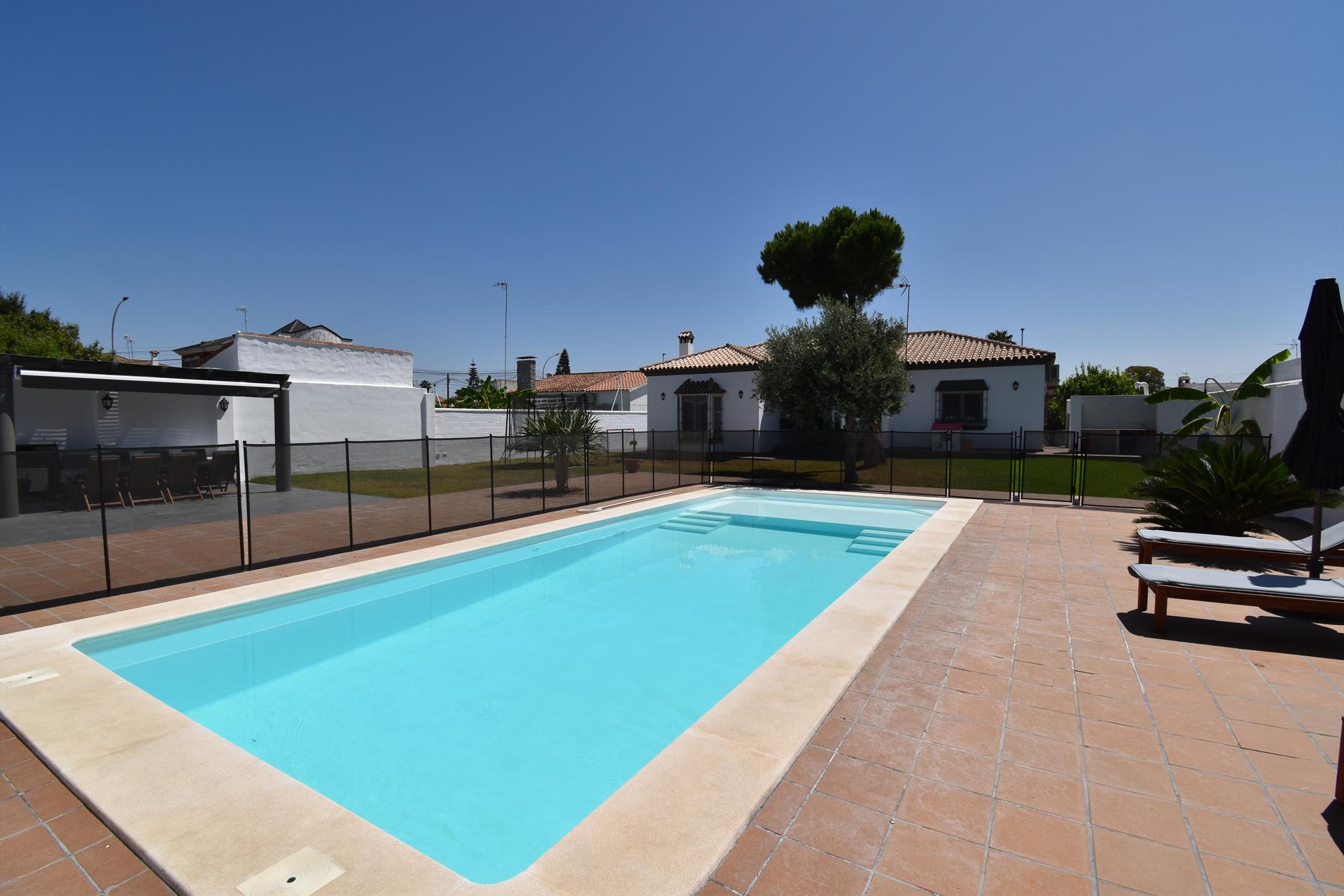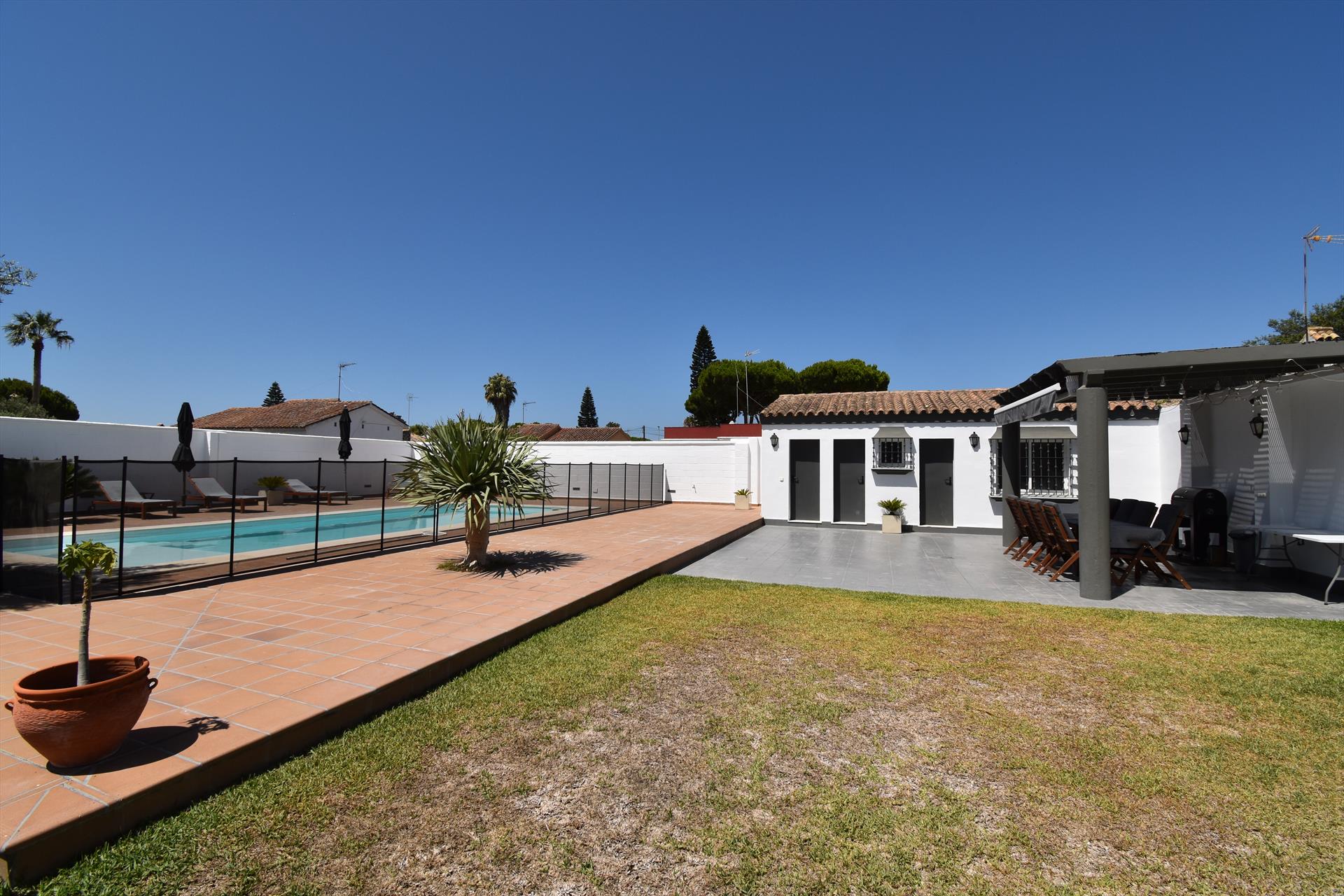 Hermosa y cómoda villa con piscina privada en Chiclana de la Frontera, Costa de la Luz, España, para 10 personas. La casa está situada en una zona residencial de playa, cerca de tiendas y supermercados, y a 4 km de la playa de La Barrosa.