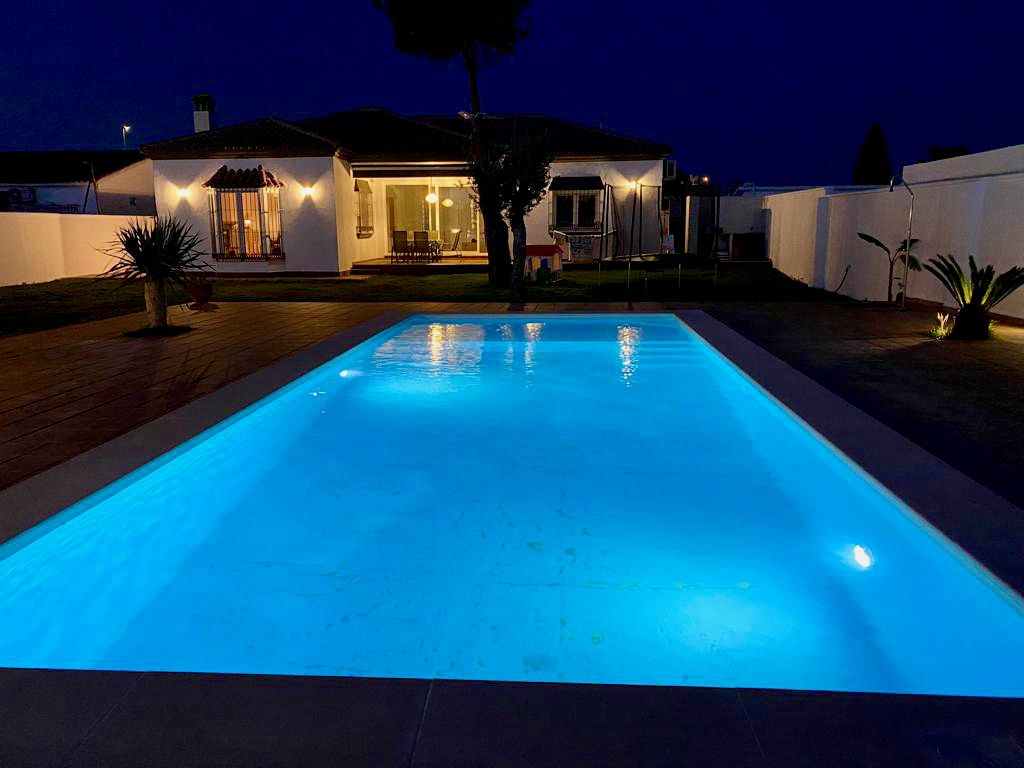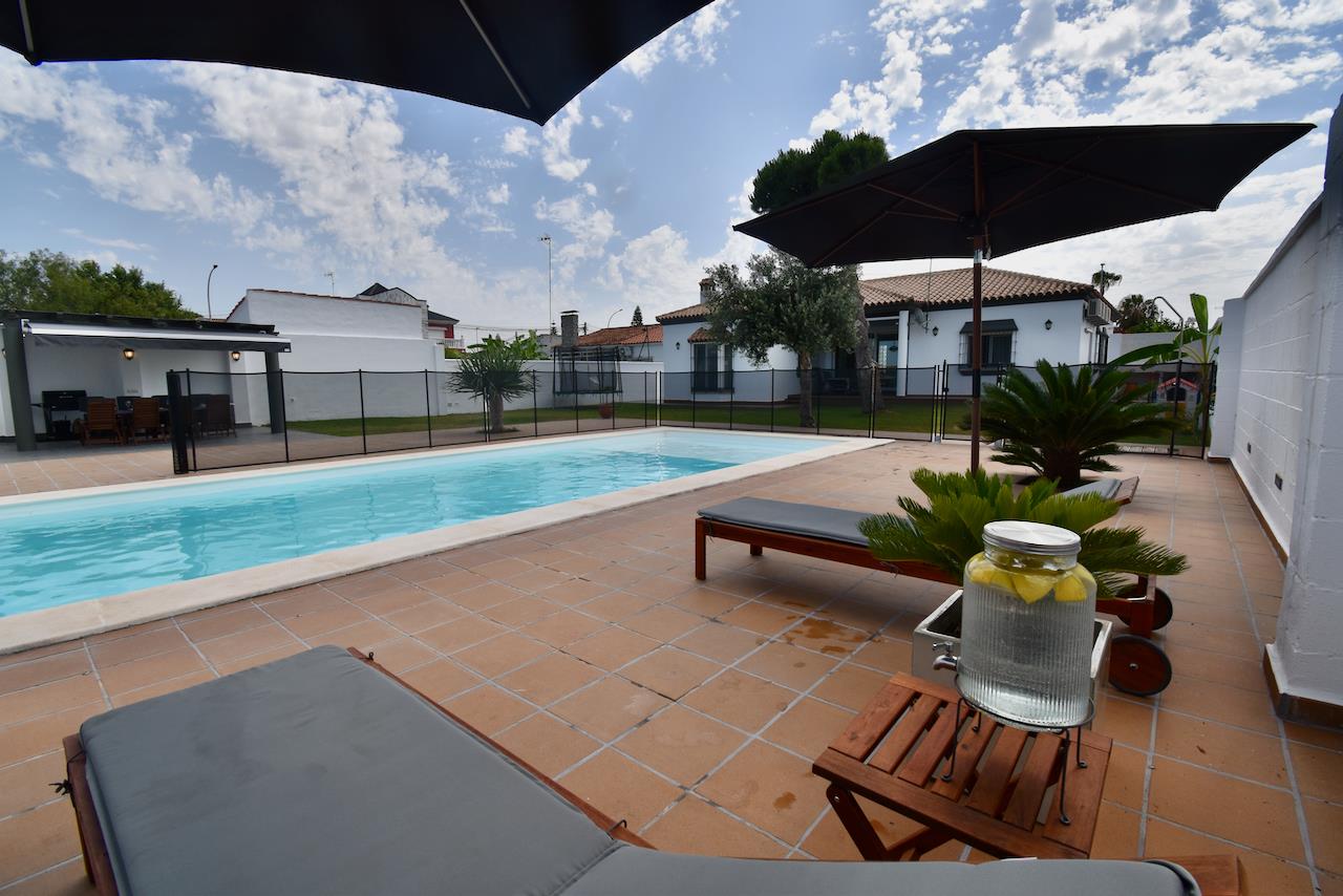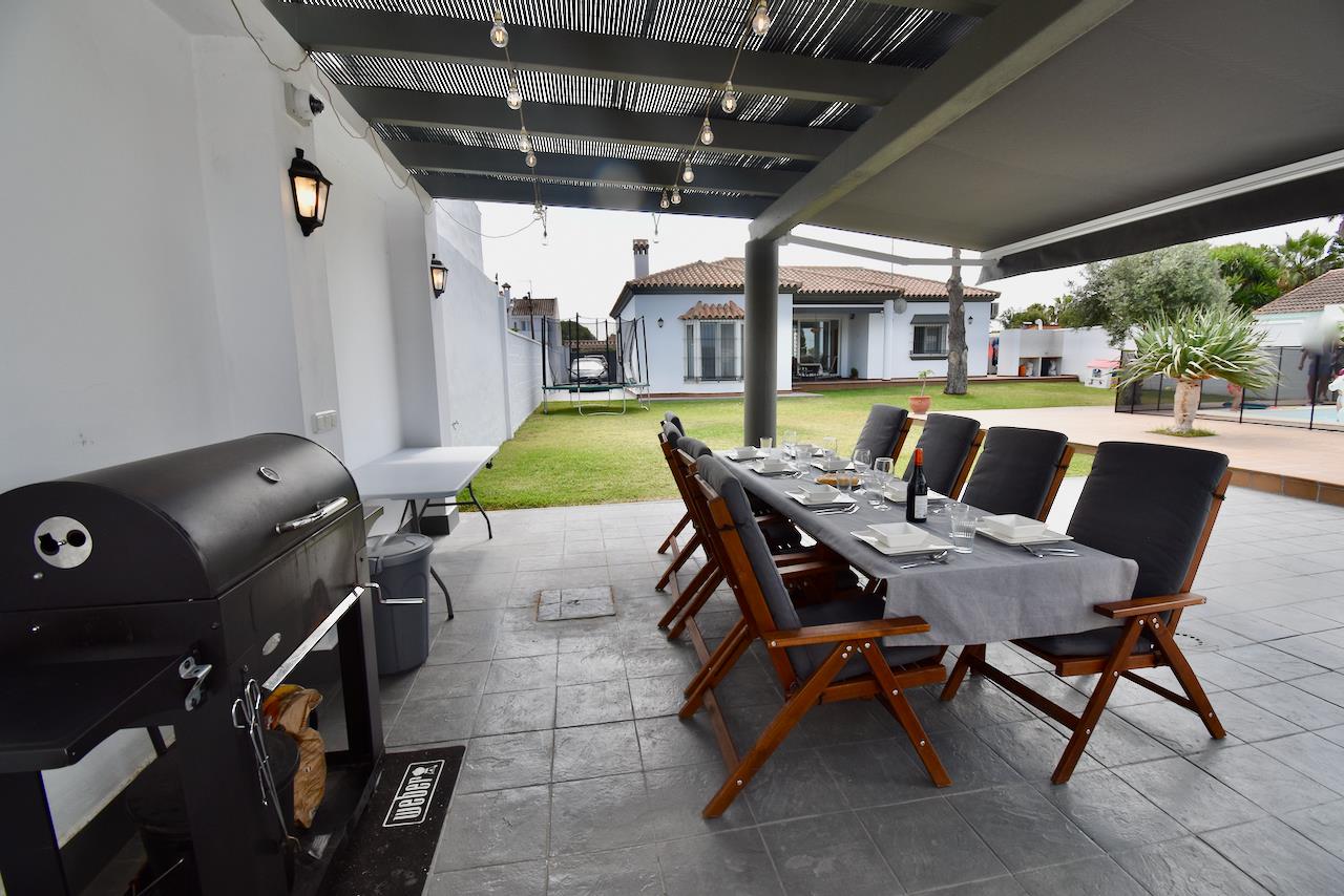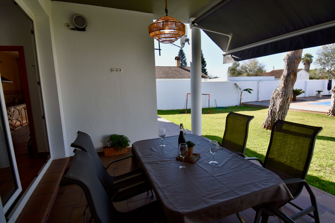 Hermosa y cómoda villa con piscina privada en Chiclana de la Frontera, Costa de la Luz, España, para 10 personas. La casa está situada en una zona residencial de playa, cerca de tiendas y supermercados, y a 4 km de la playa de La Barrosa.