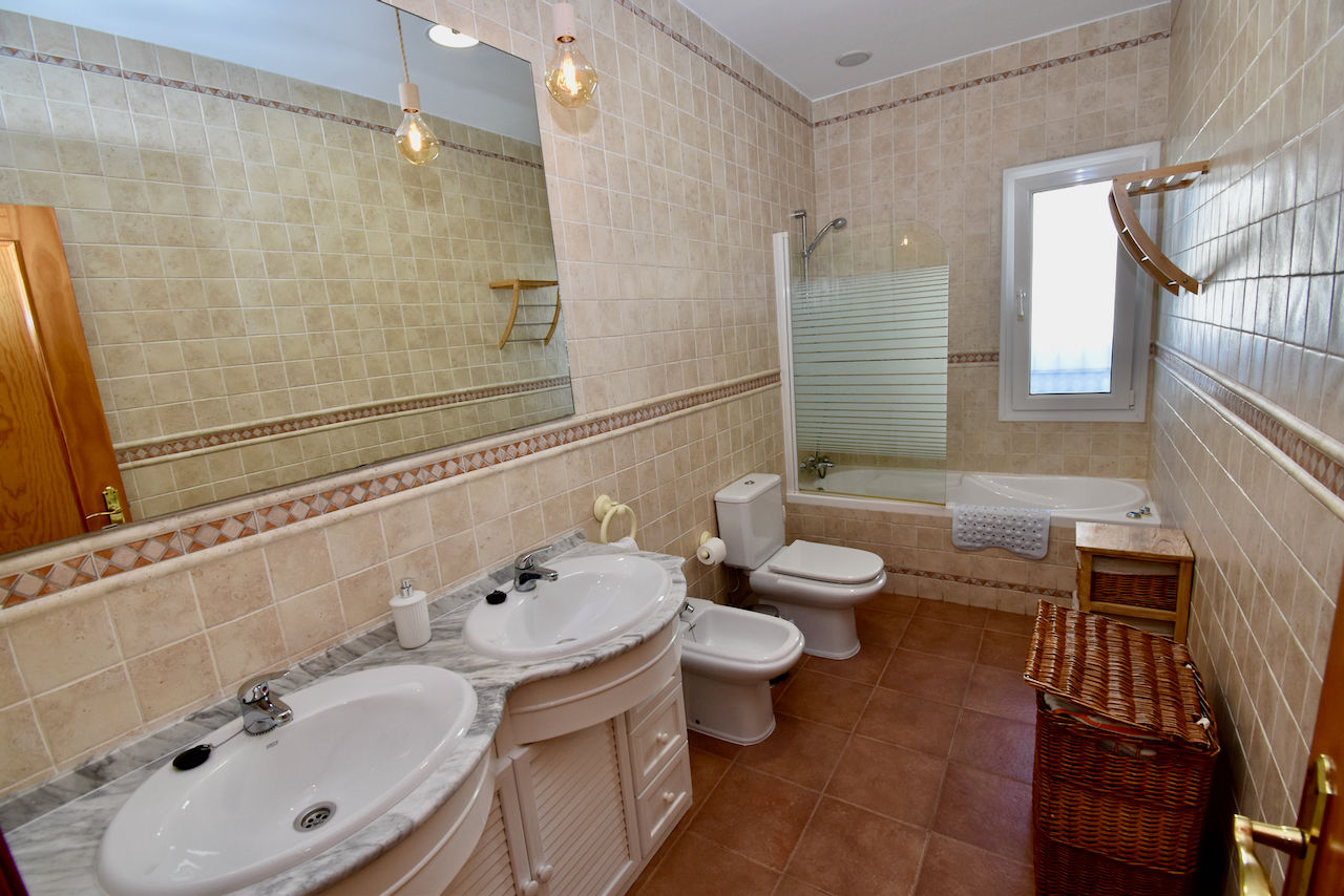 • baño en suite con doble lavabo, combinación de bañera/ducha y inodoro