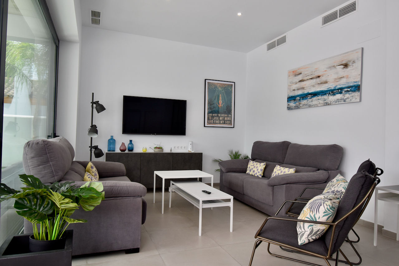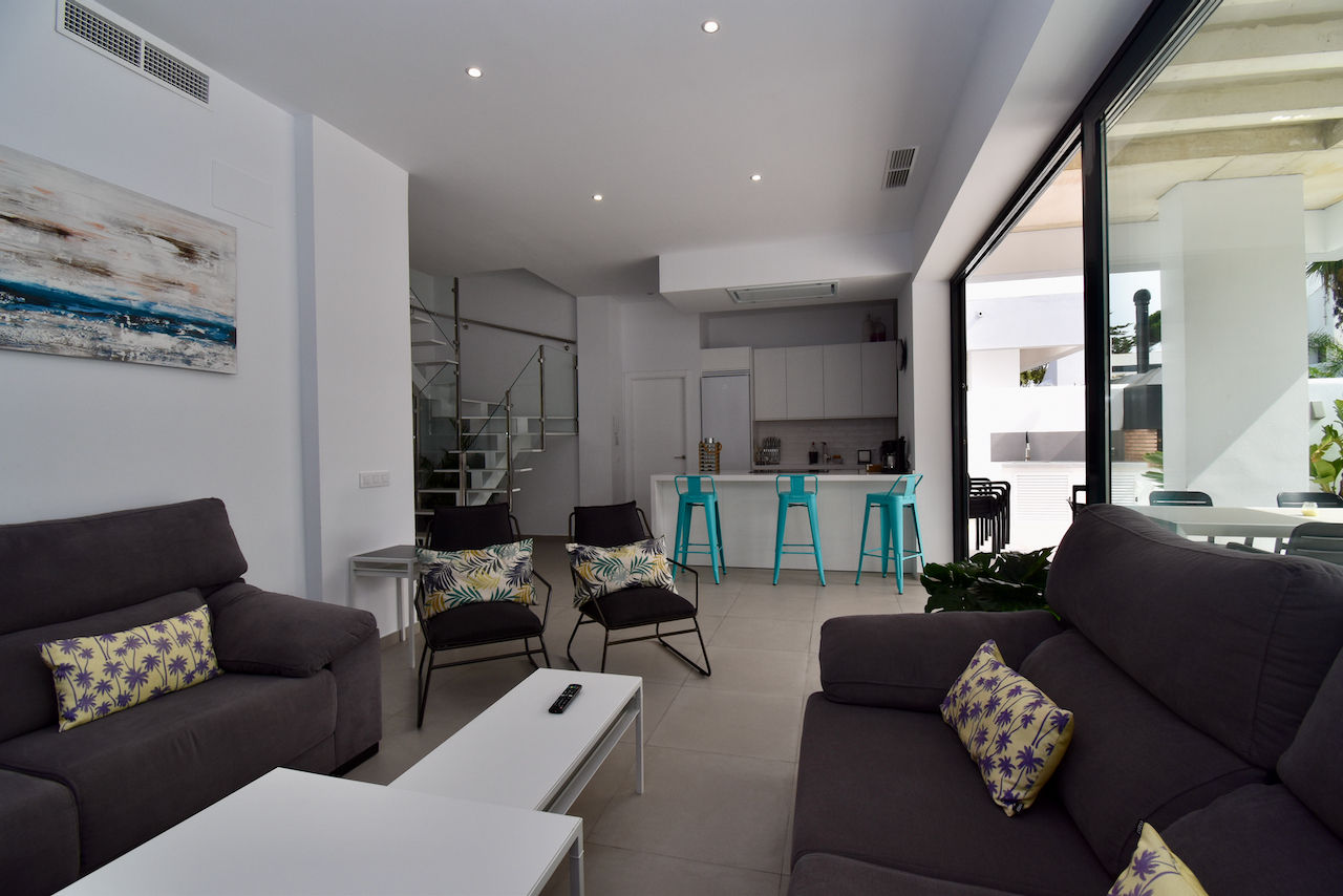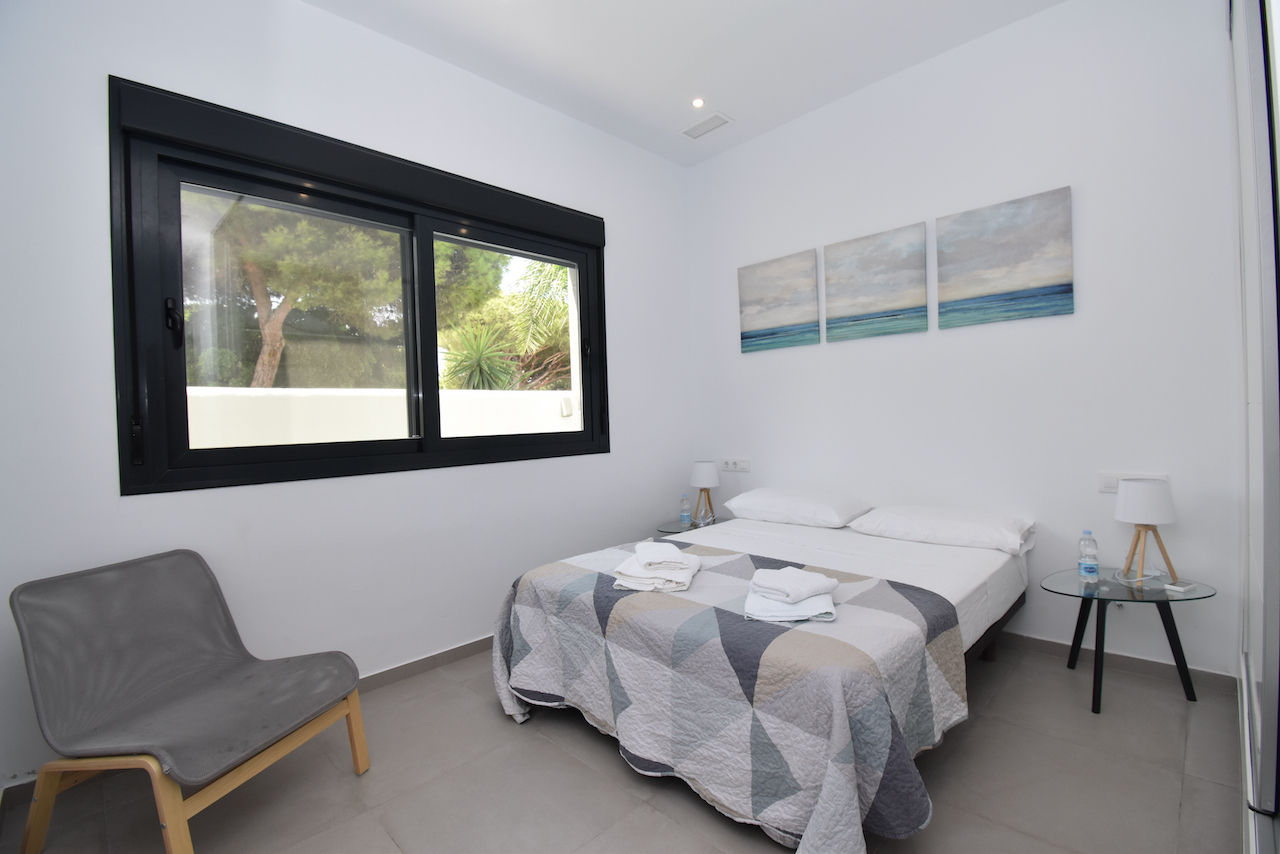 La villa tiene 4 dormitorios y 4 cuartos de baño, distribuidos en 2 plantas. El alojamiento ofrece un jardín con césped y árboles. La cercanía de la playa, sitios para salir, actividades deportivas, zonas de entretenimiento, lugares para ir de compras, lugares de interés y cultura hace de esta villa un alojamiento ideal para pasar sus vacaciones en España con familia o amigos.