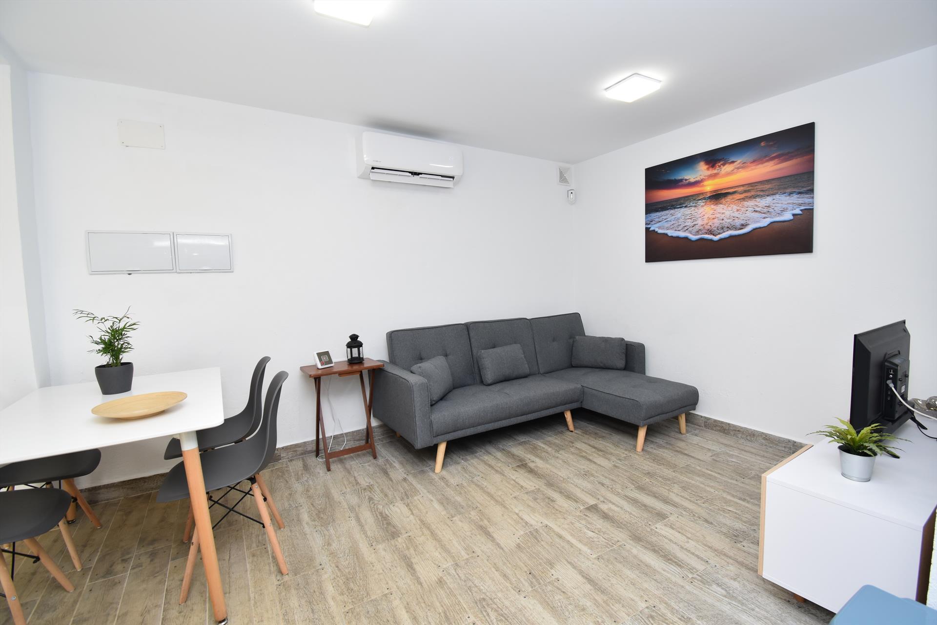 • salón de estar con aire acondicionado, televisión y sofá cama