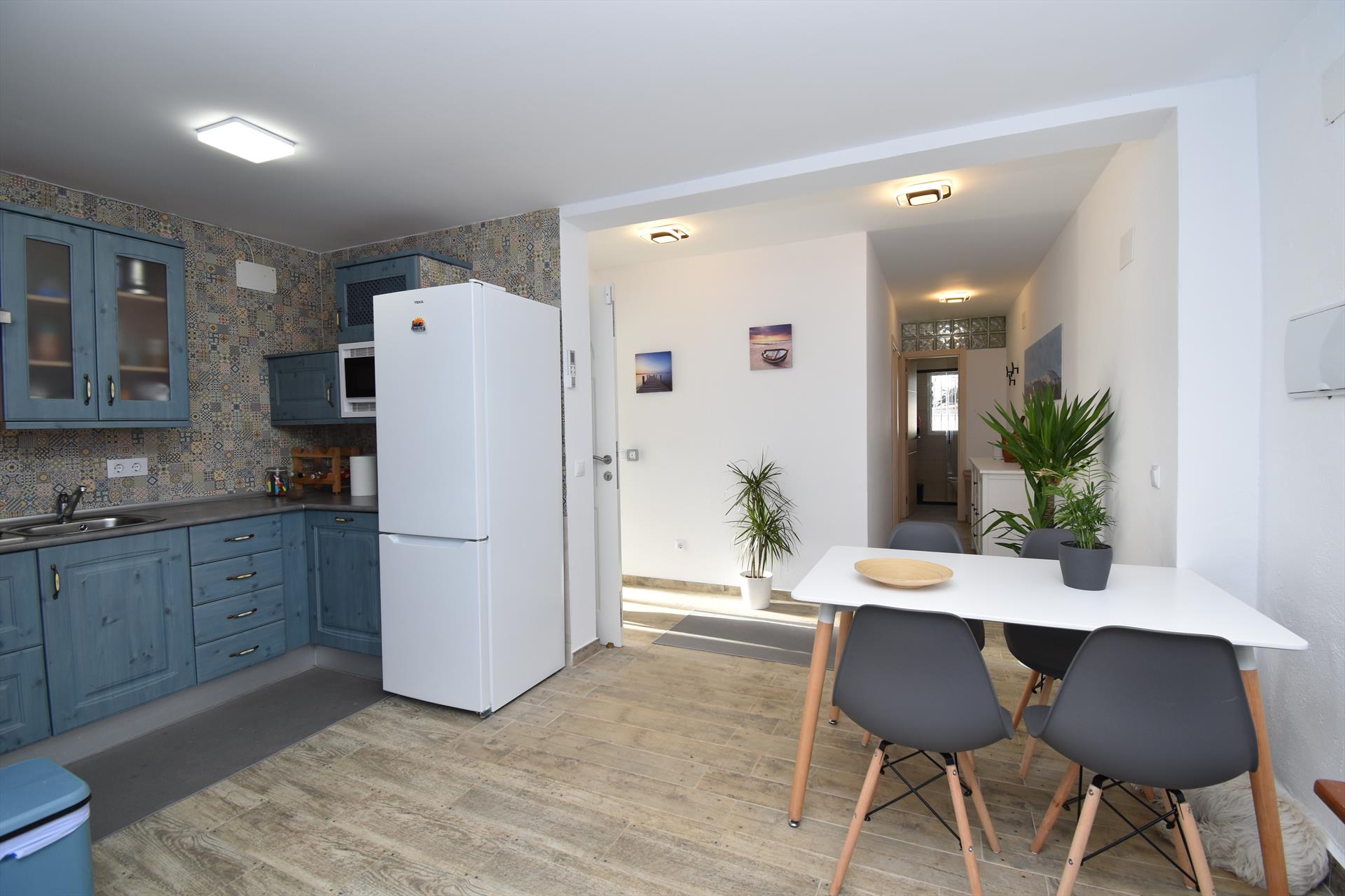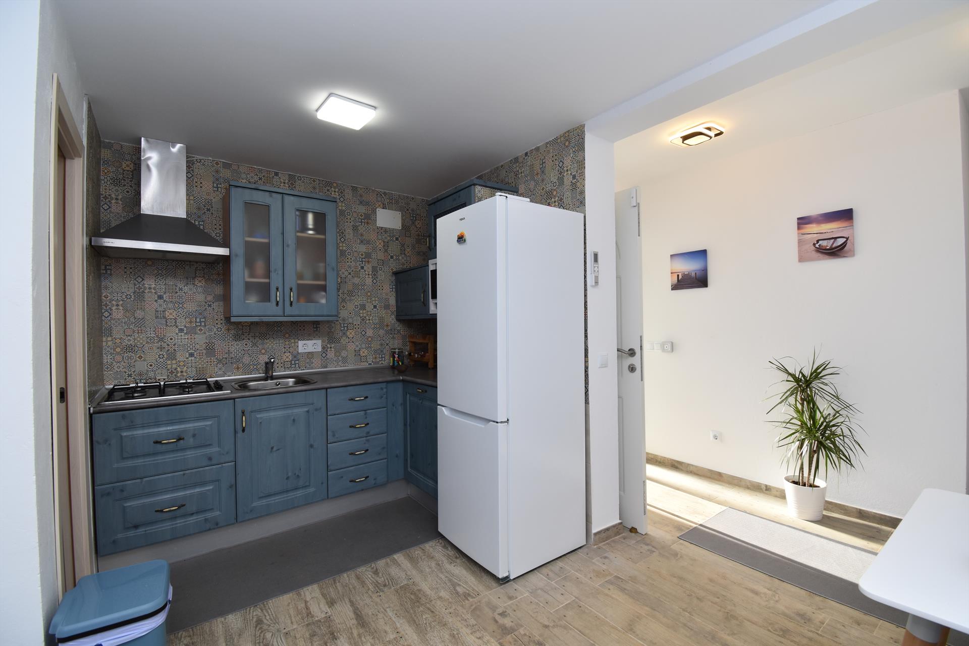 • cocina con cocina de gas, microondas, refrigerador-congelador, cafetera y tostador