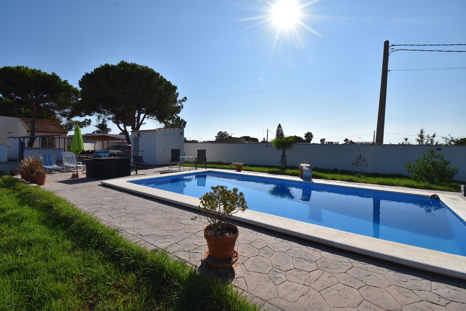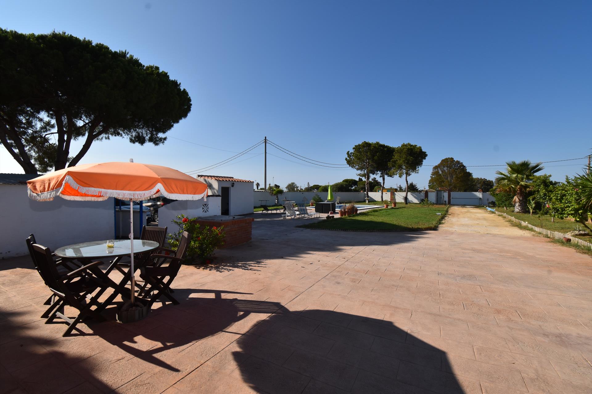 Villa clásica y cómoda con piscina privada en Chiclana de la Frontera, Costa de la Luz, España, para 10 personas. La casa se encuentra en una zona rural cerca de la playa.