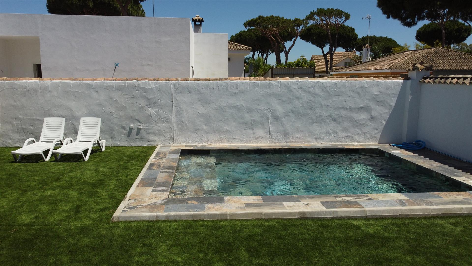 Villa rústica y confortable en Chiclana de la Frontera, Costa de la Luz, España con piscina privada para 6 personas. La casa está situada en una zona de playa y residencial, cerca de tiendas y a 2 km de la playa de La Barrosa.