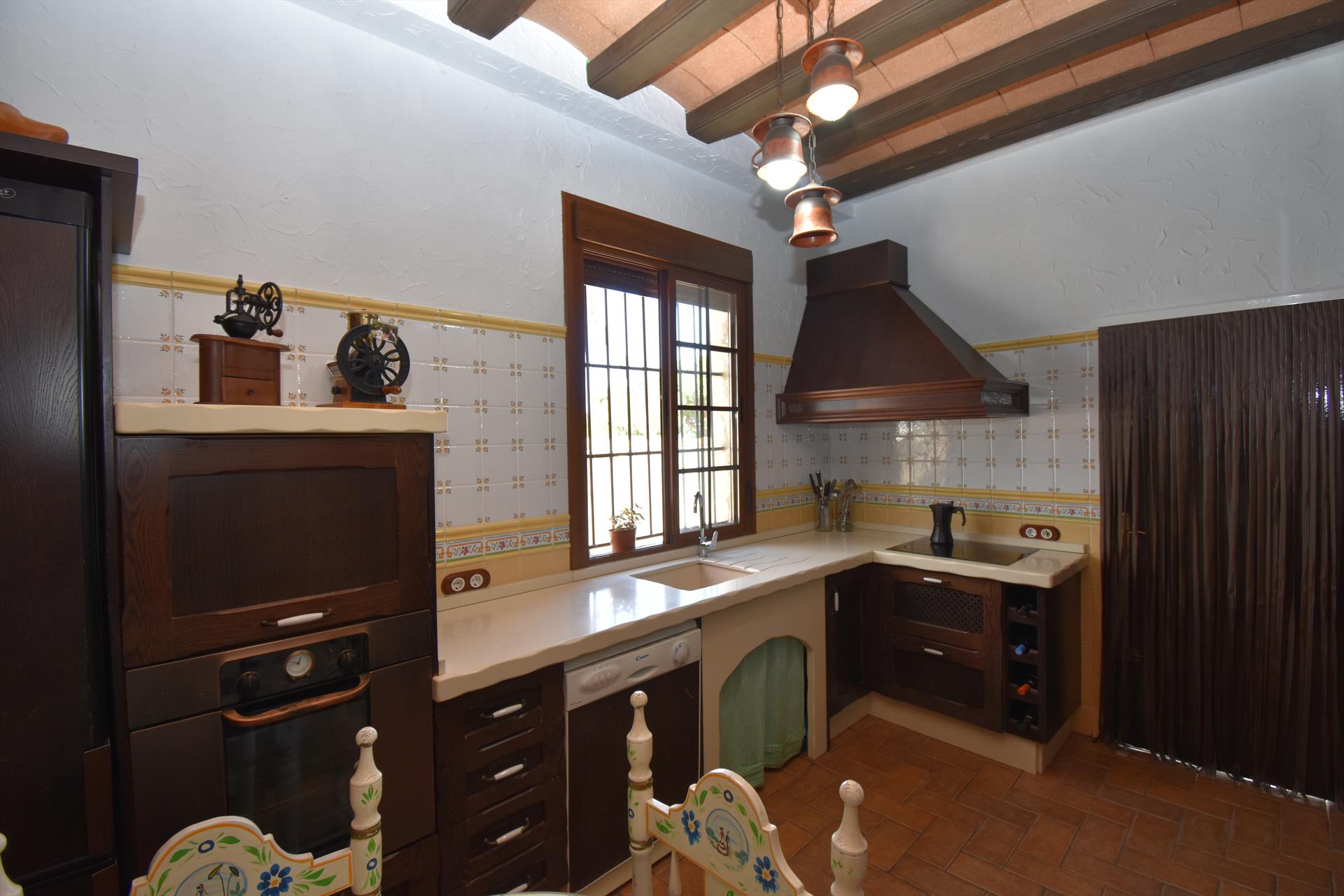 • cocina con cocina eléctrica, horno eléctrico, microondas, lavavajillas, refrigerador-congelador, cafetera, tostador y exprimidor